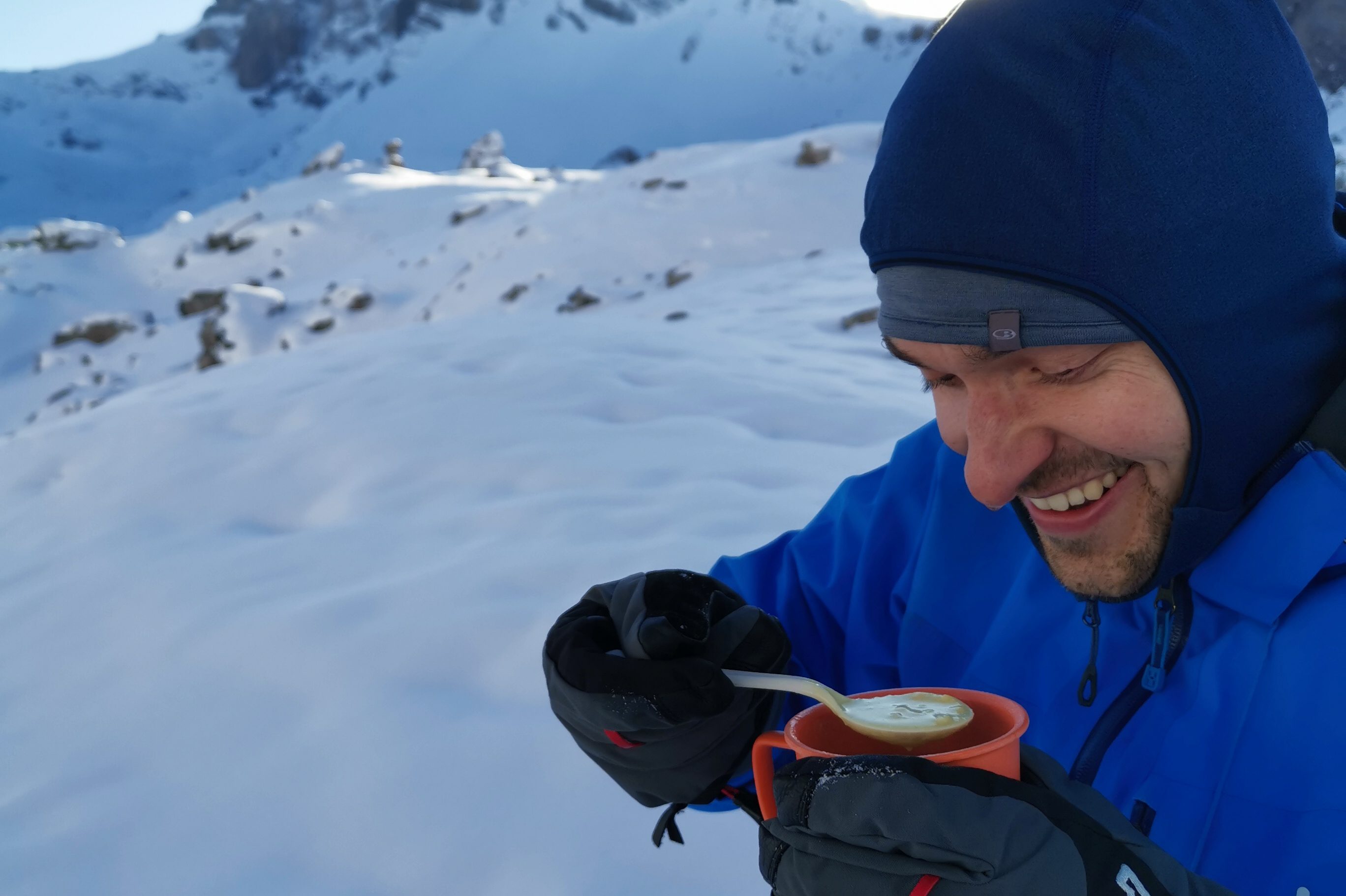 Auf einsamen Touren das Verzichten lernen und sich gleichzeitig an Kleinigkeiten erfreuen. Wie bspw. einem heissen Becher Brühe vor einer kalten Winternacht unter freiem Himmel.