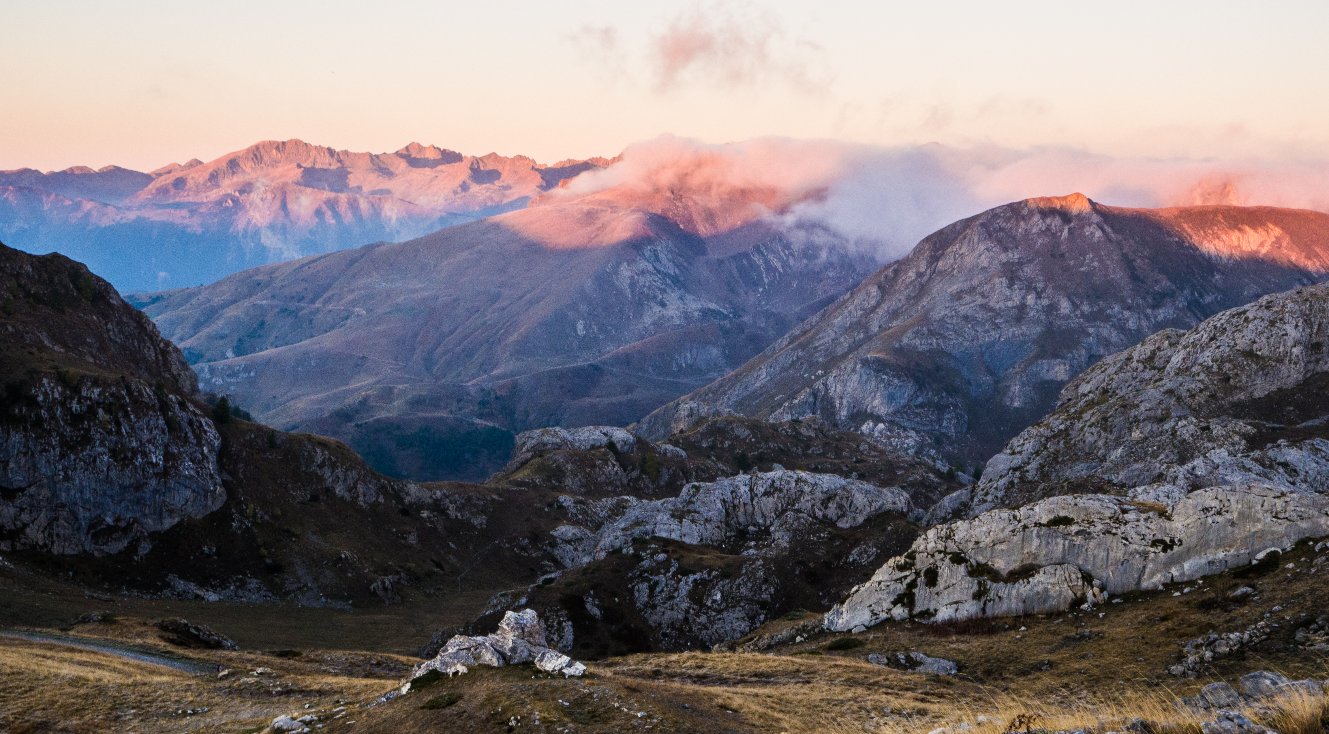 Auf dir heutigen Etappe kann man sich vom Vortag erholen. Das „Pflichtprogramm“ ist überschaubar, dafür aber sehr abwechslungsreich. Wir verlassen die Pian Rosso fast eben in Richtung der Bergdörfer-Ansammlung Carnino. Zivilisation darf nicht erwartet werden. Mit einem kleinen Abstecher können wir die Grotta delle Vene besichtigen (eine riesige Karsthöhle). Gegen Mittag erreichen wir das Colle dei Signori und damit das Tagesziel. Wenn die Aussichten gut sind, können alle, die noch Energie haben, auf den höchsten Gipfel der ligurischen Alpen steigen, die Punta Marguareis (2650 m). Dies wird zusätzliche 3 h und 500 Hm abverlangen.