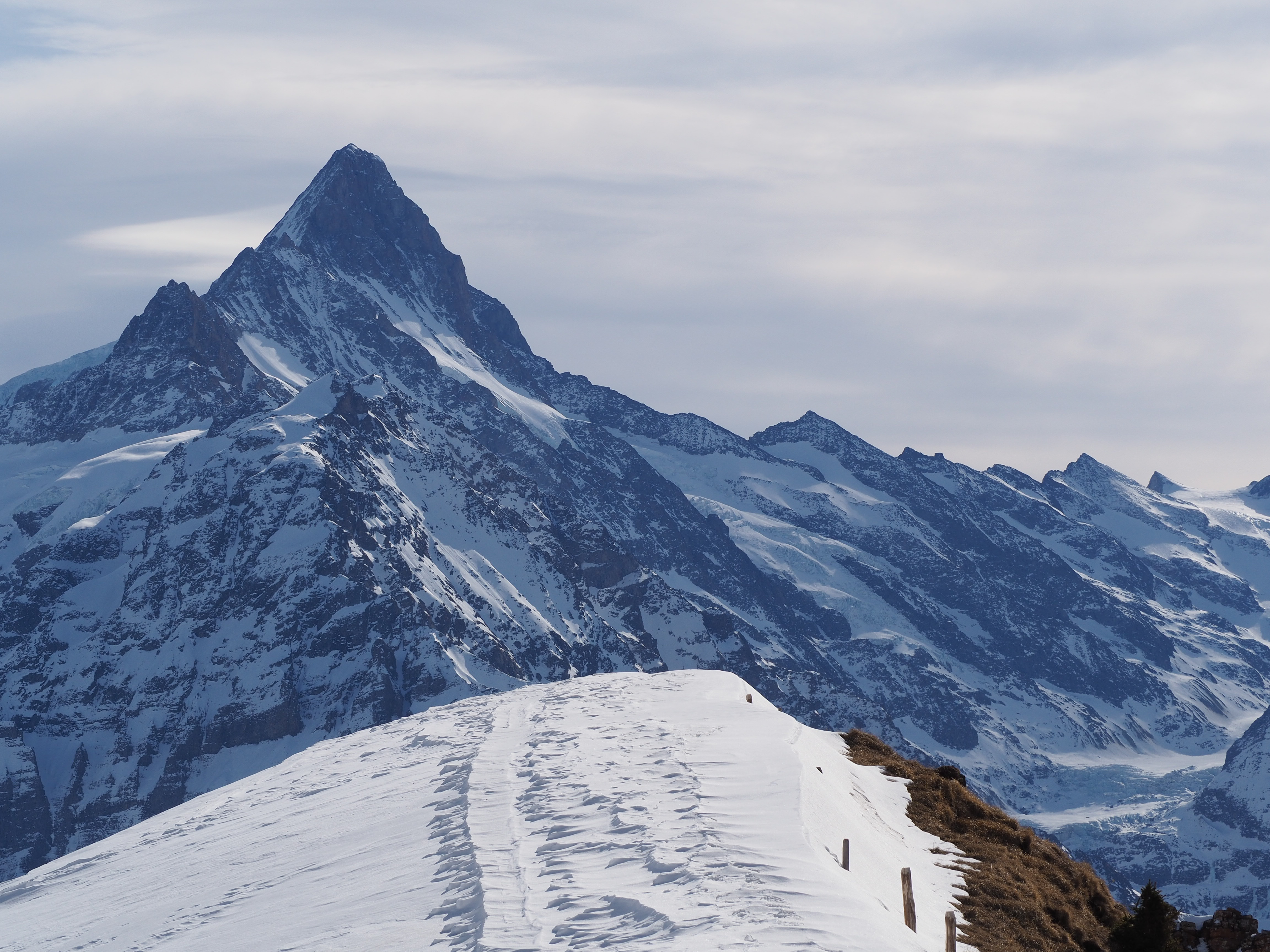 Treffpunkt zum Start dieser Tour ist der Bahnhof „Interlaken Ost“ um 9:15 Uhr. Der Zug geht um 9:35 Uhr (Gleis 2B, Tickets werden vom Organisator gekauft). Nach einer knappen Stunde Fahrtzeit erreichen wir den Parkplatz am Oberen Grindelwaldgletscher (Hotel Wetterhorn). Von hier steigen wir ungefähr in der Linie des sommerlichen Alpstässchens zur grossen Scheidegg auf. Ein abwechslungsreicher Aufstieg mit traumhaften Aussichten. Oben angekommen gibt es diverse Ausdehnungsmöglichkeiten. Neben dem direkten Abstieg Richtung Schwarzwaldalm, bietet es sich an noch ein Stück Richtung Scheidegg Oberläger zu stapfen. Von hier nehmen wir die Abfahrt der Skiroute. Durchtrainierte Schneeschuhläufer würden stattdessen von Scheidegg Oberläger wohl die Umrundung des Schrybershiri einbinden – Wir werden sehen. Alle Varianten führen letztlich zur Brochhütte auf 1500 m.