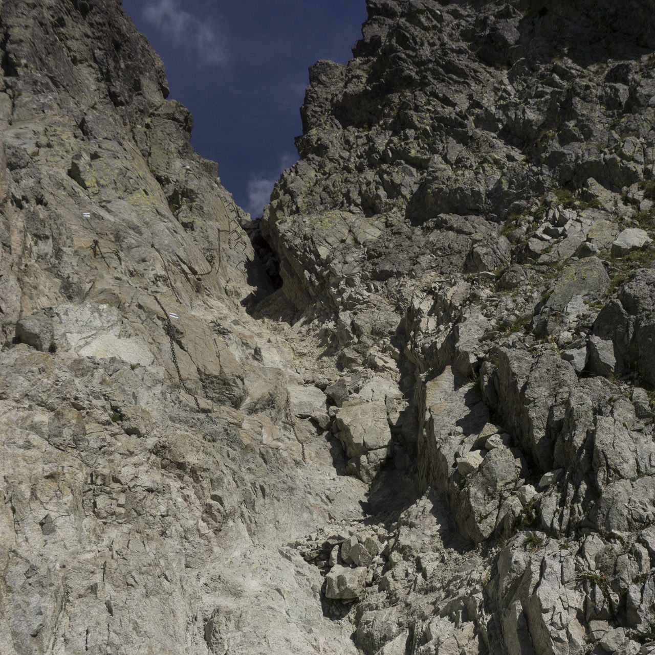 Wir steuern in westlicher Richtung das Talende an. Gewaltig ragen die schroffen Steilhänge der umliegenden Gipfel hinauf bis auf 2500 m. Die Aufstiegsseite lässt sich noch ohne grössere Schwierigkeiten überwinden. Erst im Abstieg von der Scharte kommen wieder die Hände zum Einsatz. Über 100 m Eisenketten erleichtern den Abstieg in den Kessel des Zamrznute Pleso („Gefrorener See“). Am Seeufer, haber wir den Übergang gemeistert.