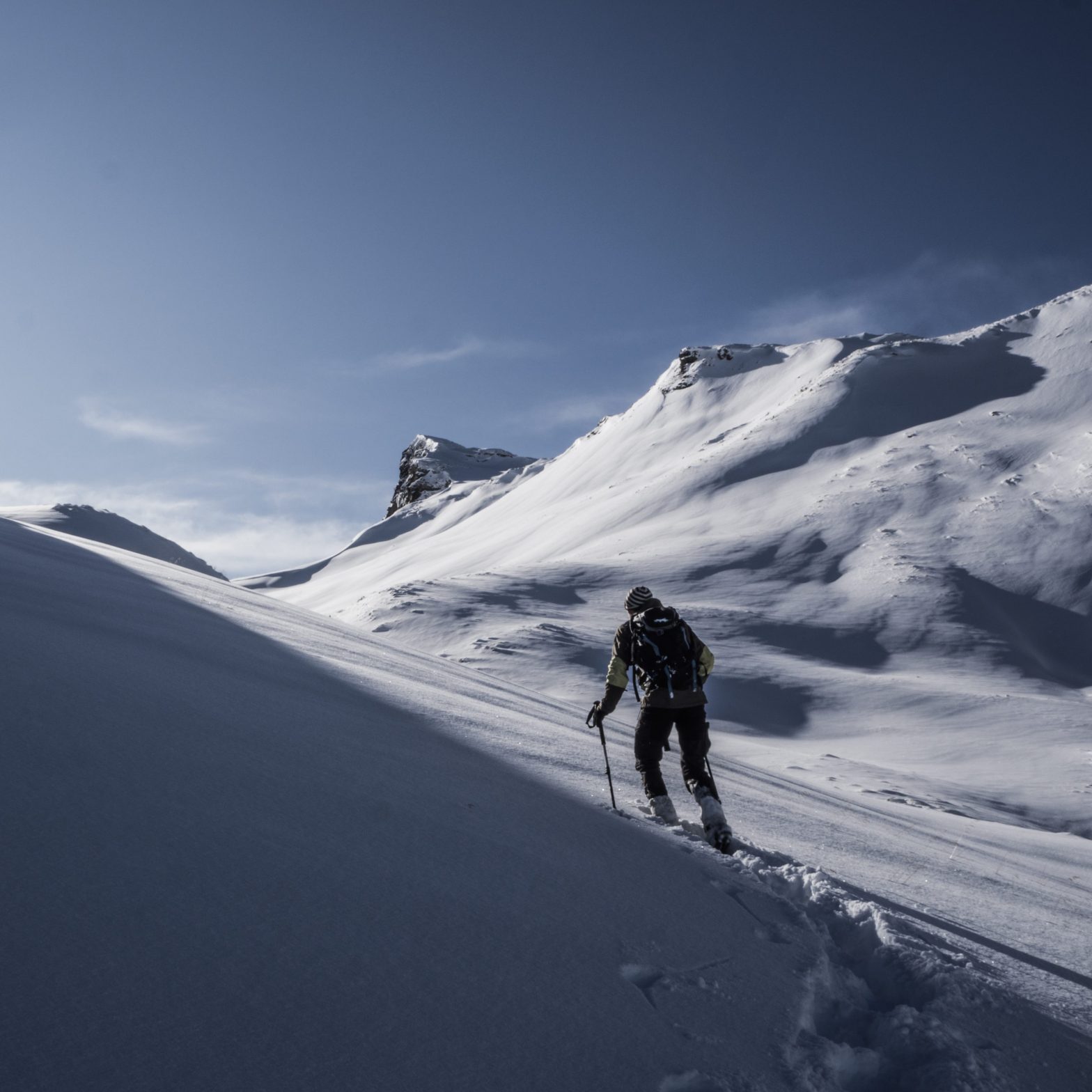 Aufgrund der dünnen Schneedecke in diesem Jahr begehen wir den Gletscher am Seil. Die technische Ausrüstung der Tour umfasst daher neben Schneeschuhen und LVS-Set auch Hochtouren-Ausrüstung wie Klettergurt, Pickel, Schlingen/Schnüre und Eisschrauben. Auf Steigeisen und Helm kann verzichtet werden.