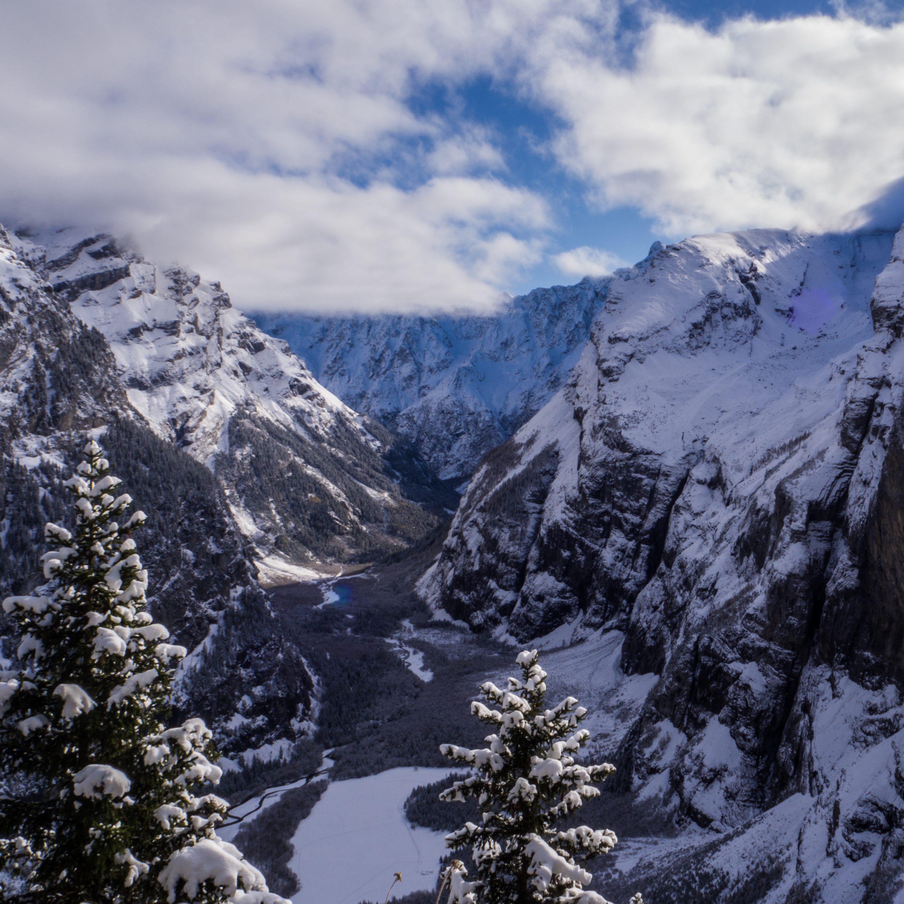 Wir bleiben anschliessend auf dem Winterwanderweg Richtung Gemmi und passieren den Berggasthof Schwarenbach sowie den zugefrorenen Daubensee. Nach einem kurzen Abstieg geht es in westlicher Richtung auf die Hochebene des Lämmerenbodens. Zuletzt holen wir in leichtem Bogen aus, um den Felsriegel zur Lämmerenhütte zu überwinden.